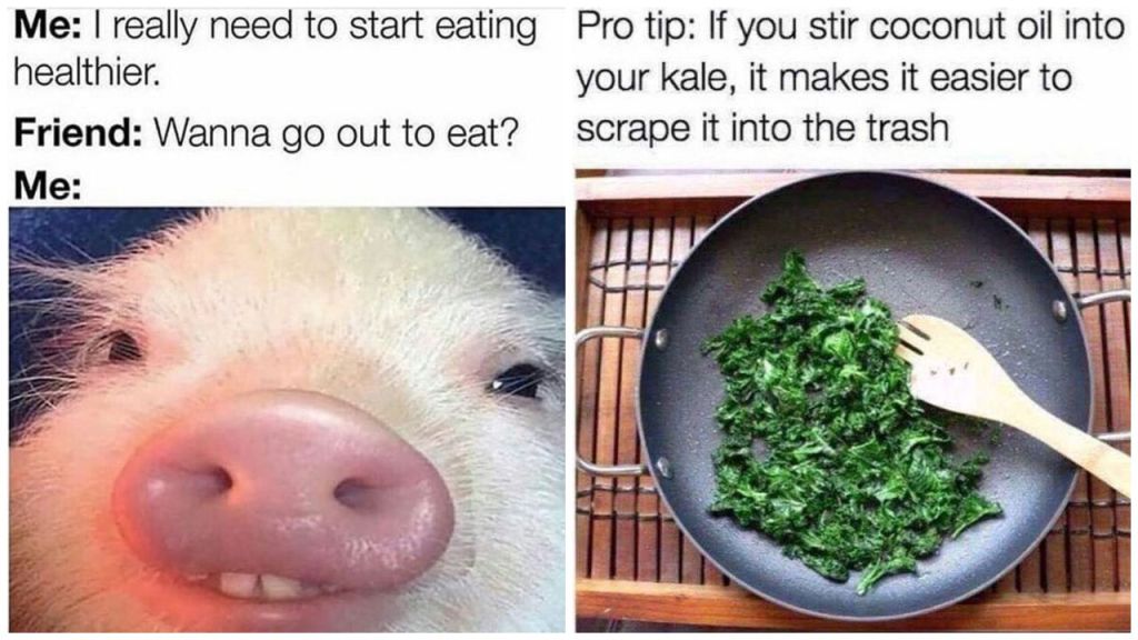 This meme is very very… let’s just talk about that later. So on the right side you see some food and honestly I would have ate it, like.. who wastes food. Also on the right side is some really weird picture of a pig… and I’m guessing he’s going with his friend to eat healthy food…. Anyways that’s I’ll try to post some food that I have made.